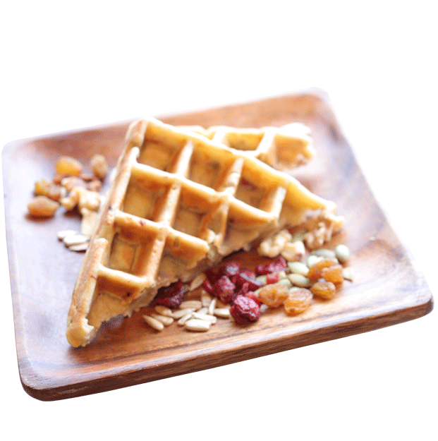 ドライフルーツやナッツは、国産有機栽培では揃えるのが難しいため、外国産の有機栽培を厳選して使用しております。ワッフルの隠し味に使うスパイスも、有機栽培にこだわりミックスしております。 そのため、季節や素材により味の変更などがあります。ご了承ください。